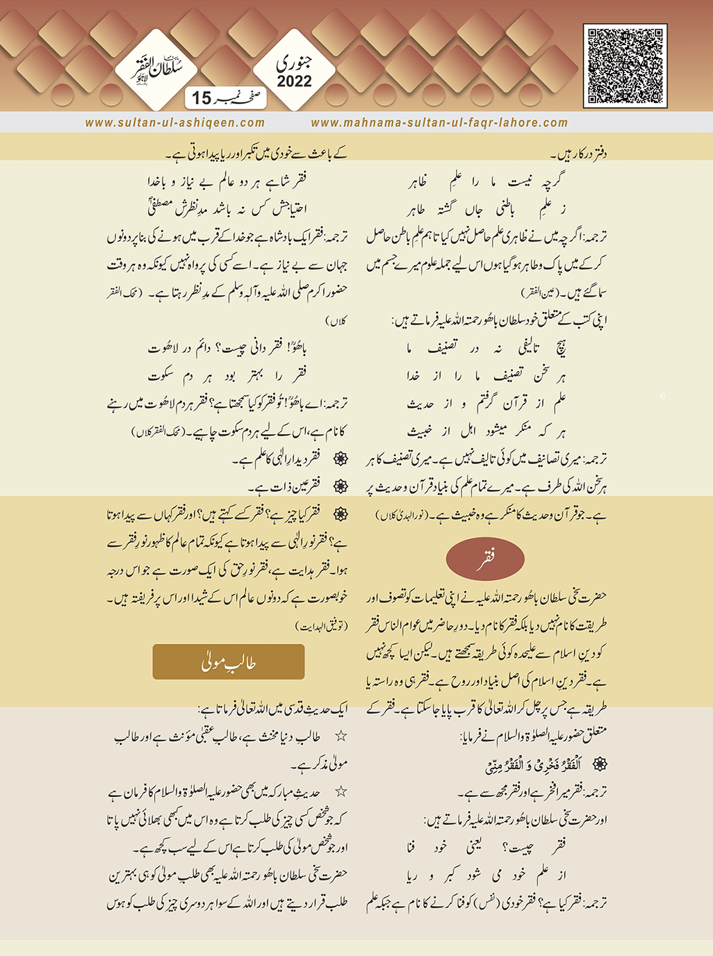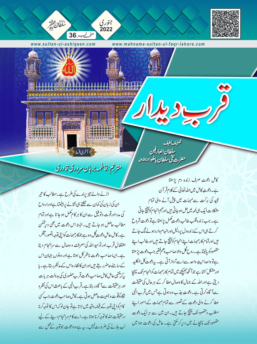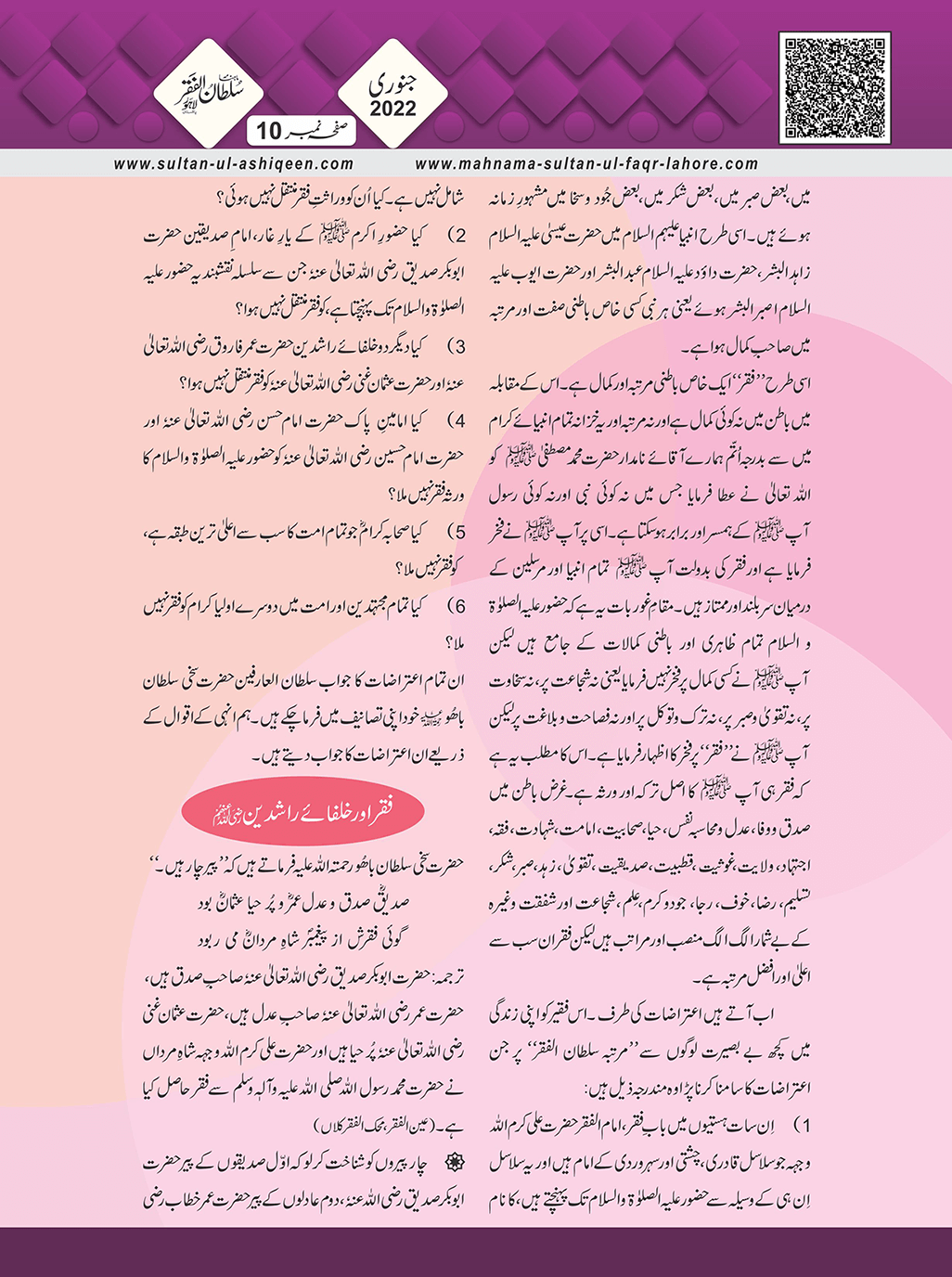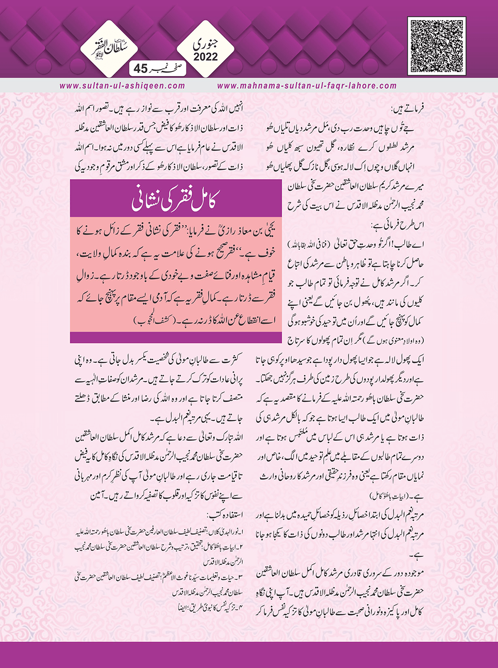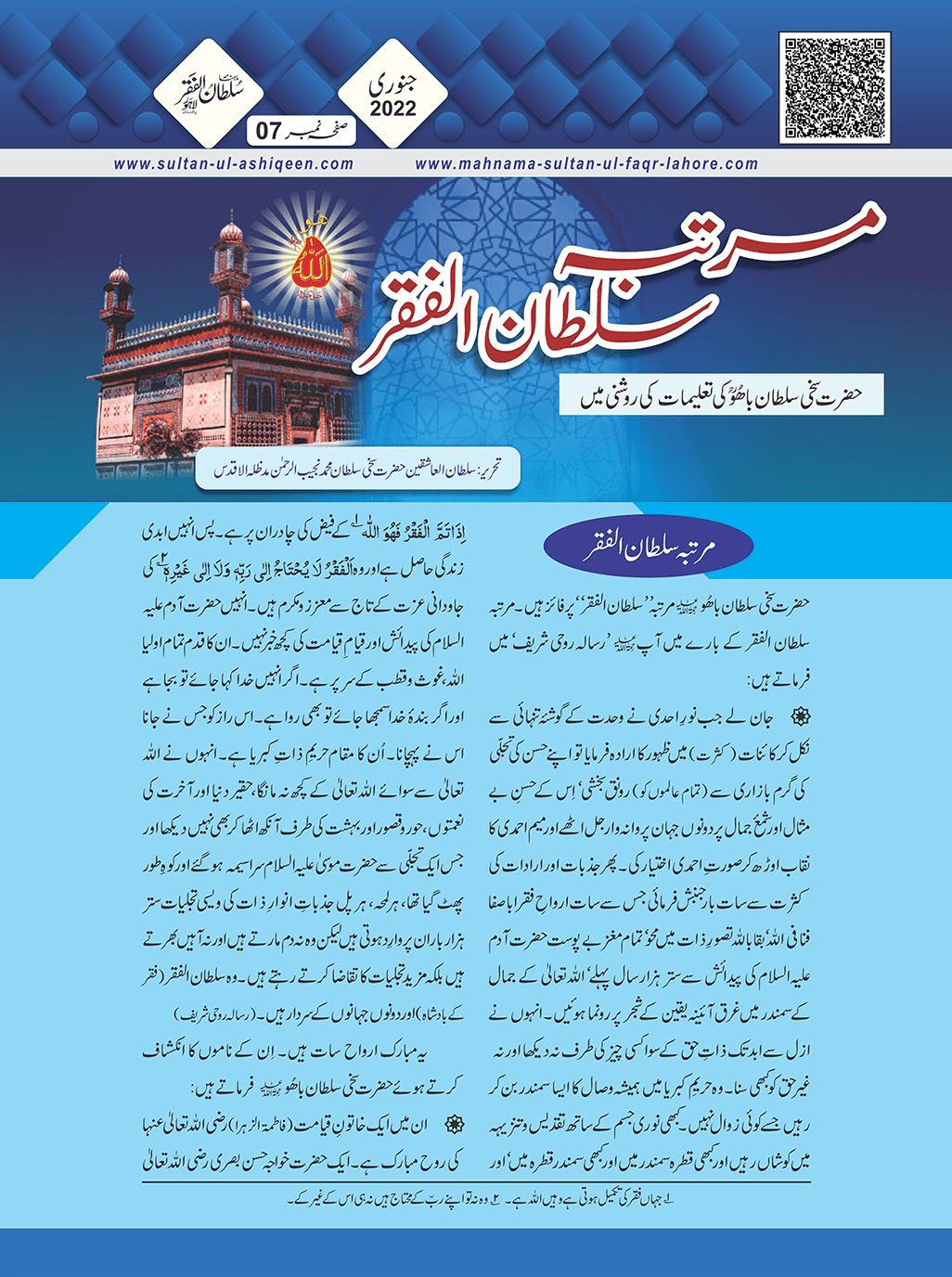 1. Sultan -ul -Faqr Magazine Faqr ke talimaat ko poori Dunia mein Phaila raha hey.iss magazine ko lazmi perhna chaheay.